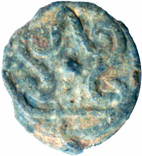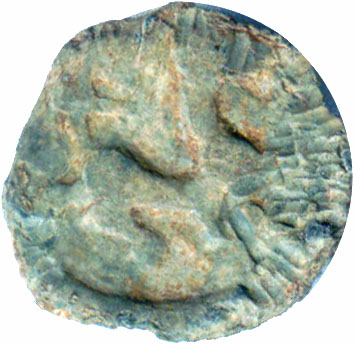 ![]() Not Plate specimen. Brahami Text different from A43. Detailed features on fish is incredible. Swastika on side opposite Brahami text. | |
