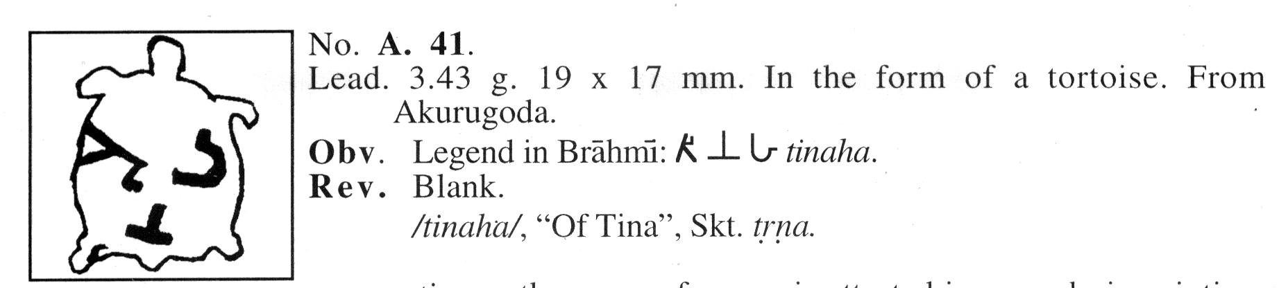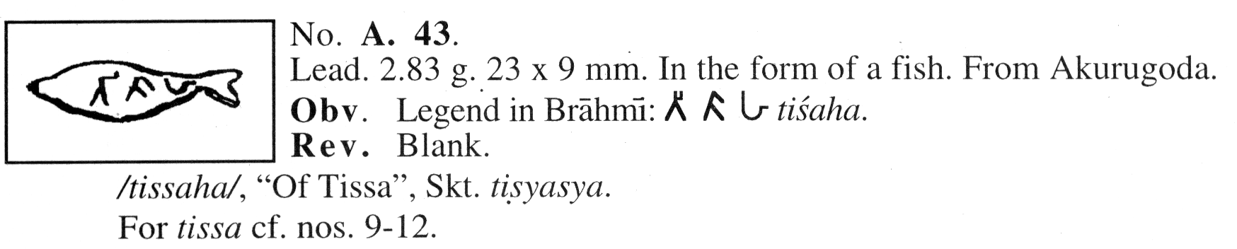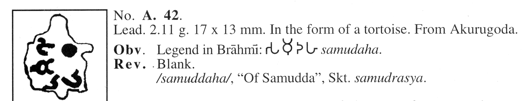 Most are inscribed lead tokens and include the 3 used in the cover illustration of the book published in 1999 by Osmund Bopearachchi and Rajah Wickramasinhe (OBRW) titled Ruhuna An Ancient Civilization Re-visited. Numismatic and Archaeological evidence on inland and Maritime Trade. These Tokens found mainly in Akurugoda are most often unique. Published Weight and Measured Weight had typical 0.05 grams errors in weight.