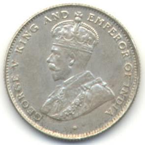 The obverse of the coin carries crowned Head to left in relief in center of the legend GEORGE V KING AND EMPEROR OF INDIA Initials of designer B.M. in relief on the truncation of the shoulder put in by designer Sir Edgar Bertram Mackennal.