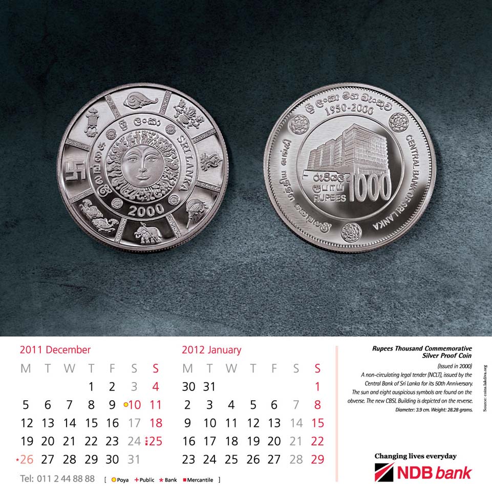 | December | 2011 - | January | 2012 : | CBSL 50th Anniv. Rs 1000/- Silver coin |