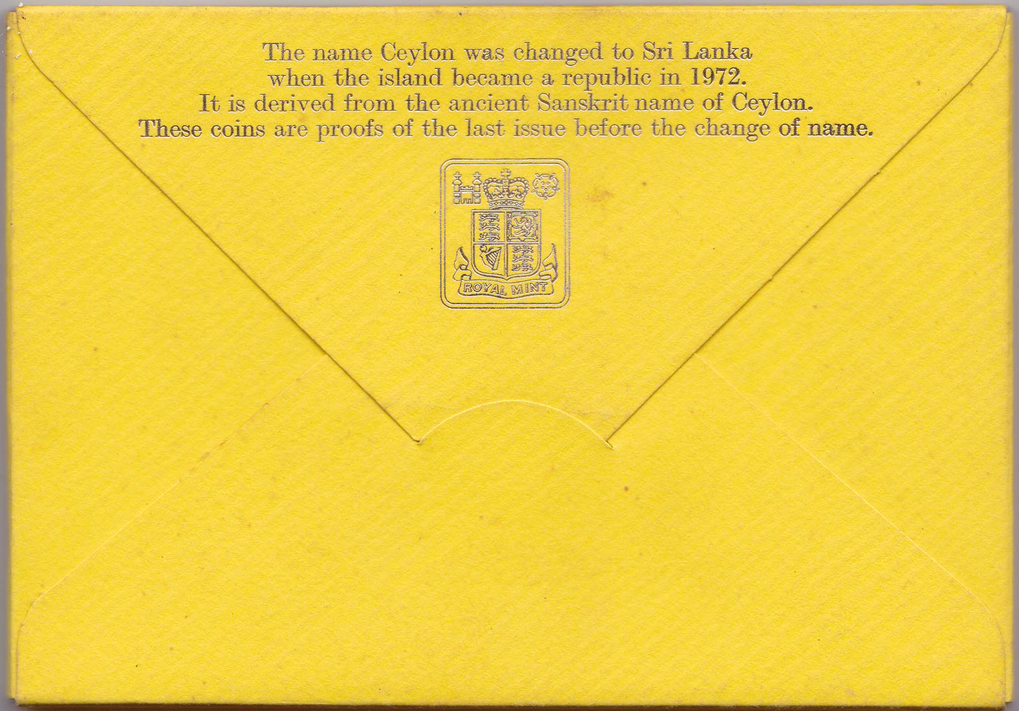A Proof Coin Set minted by the Royal Mint in 1974 October it its "Coins of the World" Series as the last issue of Ceylon coins before the official name in English changed to Sri Lanka on 1972 May 22nd.