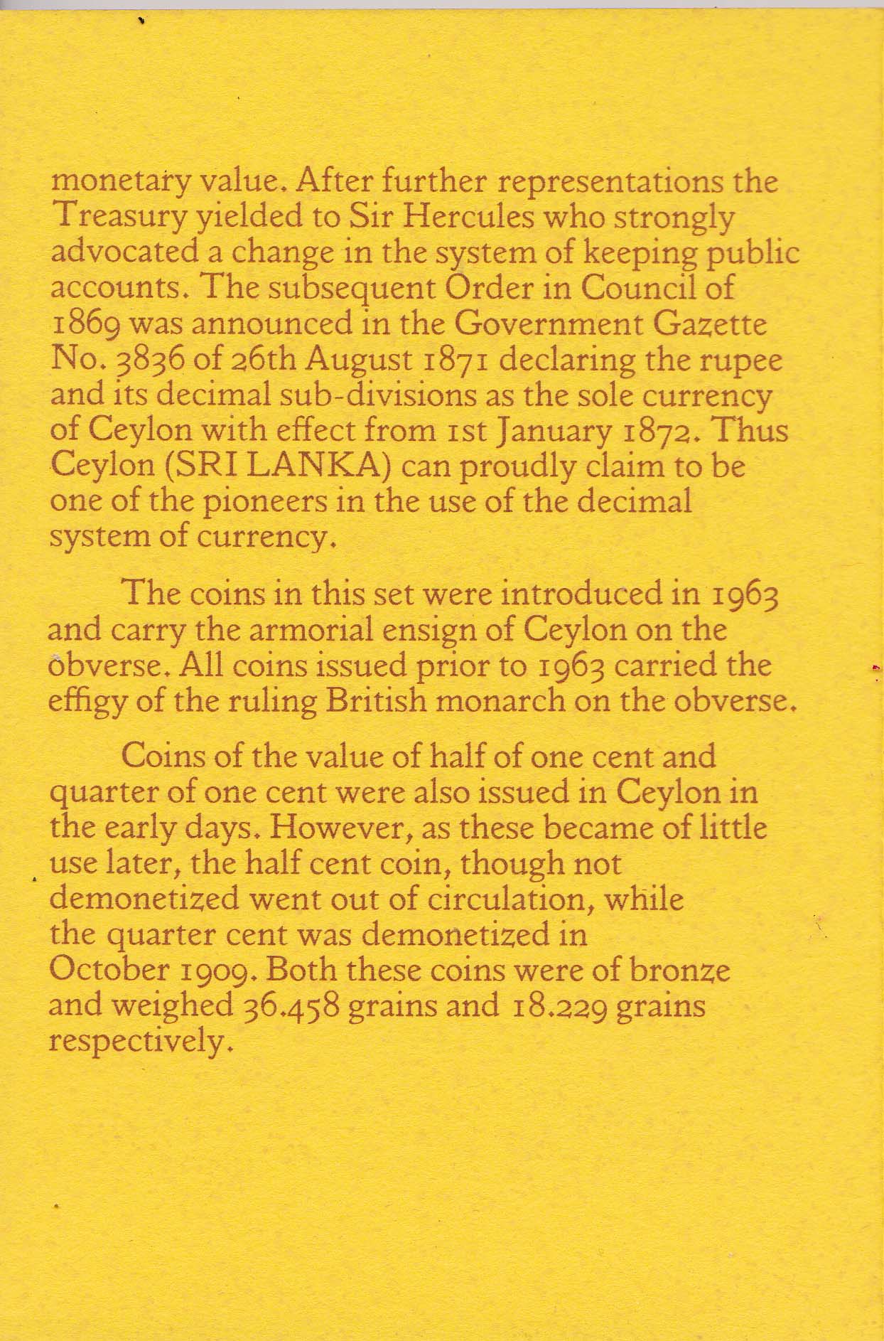 Coins of the value of half of one cent and quarter of one cent were also issued in Ceylon in the early days. However, as these became of little use later, the half cent coin, though not demonetized went out of circulation, while the quarter cent was demonetized in October 1909. Both these coins were of bronze and weighed 36.458 grains and 18.229 grains respectively.