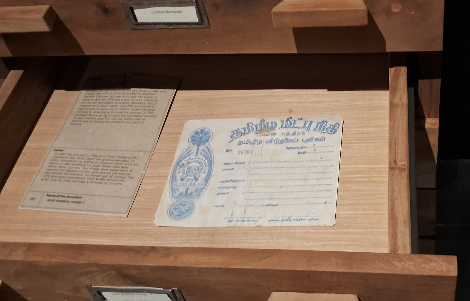 According to Dr T Sanathanan of Fine Arts, Jaffna University the lottery started few years after the initial collection to return some of the gold collected. Most did not get the loan returned. When the Receipt was shown, a pass was issued to permit one to leave Jaffna, but this permit was collected back at the last LTTE check point, and therefore unavailable to document.