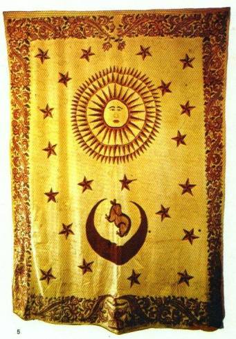 The Hathara Korele Dissawa Flag - Kegalla shown on right has Sun above the Cresent Moon facing up as in the Sun and Moon on the Lanka type IA Kahavanu, gold coin.