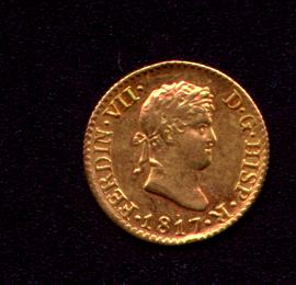 SPAIN - HALF ESCUDO FROM 1817. THIS COIN IS IN CHOICE VERY FINE CONDITION. IT CATALOGUES FOR $150 IN VERY FINE. IT IS A REAL BEAUTY AND WOULD BE THE HIGHLIGHT TO A 19TH CENTURY SPANISH GOLD COLLECTION. BUYER TO PAY $5 FOR SHIPPING AND INSURANCE. PAYMENT BY POSTAL MONEY ORDER, BANK CHECK AND PERSONAL CHECK ACCEPTED. PLEASE ALLOW 7 DAYS FOR PERSONAL CHECKS TO CLEAR. INTERNATIONAL BUYERS PLEASE INQUIRE AS TO SHIPPING AND INSURANCE RATES TO YOUR COUNTRY. I LOOK FORWARD TO DOING BUSINESS WITH YOU IN THE FUTURE.